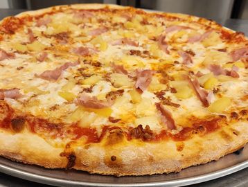 Pineapple, Ham, Bacon, Mozzarella.