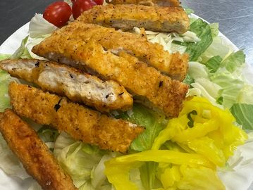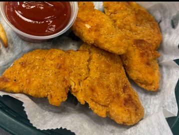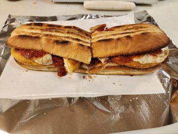 Tender breaded chicken breast baked with cheese and sauce.