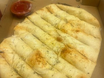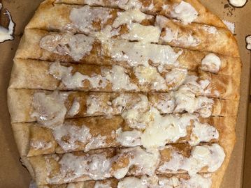 Breadsticks baked with butter, cinnamon, and sugar on them, then smothered with cream cheese icing.
