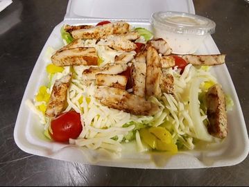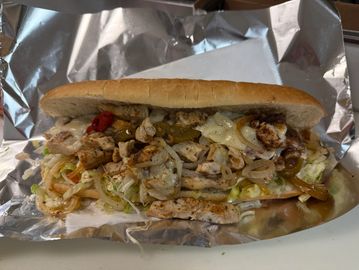 Grilled Chicken, lettuce, tomato, onions, banana pepper & cheese.