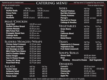 Half Trays serve 12-15 people Full Trays serve 35-40. Payment due prior to scheduled event. Sales Tax not included in prices. Delivery Fee may apply. Servers available upon request for an additional fee and is subject to 18% gratuity.